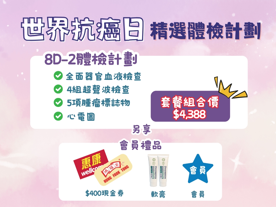 ✅ 肺癌 ✅ 肝癌 ✅ 胃癌 ✅ 腎臟癌✅ 大腸癌 ✅ 頭頸癌 ✅ 鼻咽癌✅ 乳腺癌 ✅ 子宮頸癌(女士) ✅ 前列腺(男士)