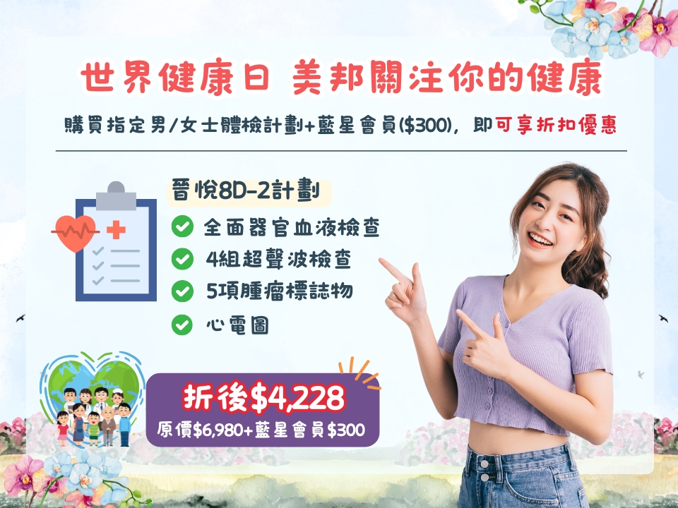 美邦醫學體檢中心的專業醫護團隊為你提供一站式的全面身體檢查服務,有效評估你的個人健康狀況,達致「預防勝於治療」的效果。事實上,定期進行健康檢查,可及早發現潛在的健康風險,即使不幸患病,亦可及早治療,從而對症下藥,提高痊癒機會。因此,定期身體檢查在「預防醫學」上扮演了一個非常重要的角色,使人防患於未然。 美邦為切合客人對身體檢查的需要而提供不同類型的全身檢查服務。包括男性、女性、銀髮族、青少年、婚前及針對性香港體檢服務,使客人能按個人需要挑選合適的驗身計劃。所以客人在購買健康檢查計劃或驗身項目前應仔細考慮個人需要,購買合適的驗身計劃。客人可因應自己對身體檢查項目的需要,選擇不同類型的身體檢查 ﹔如超聲波檢查、腫瘤標誌物檢查、生育功能身體檢查等。 美邦旨在成為身體檢查香港行業的佼佼者,並承諾繼續以專業的醫護團隊、先進的檢查儀器、認真的服務態度,為顧客提供優質體檢醫療服務。