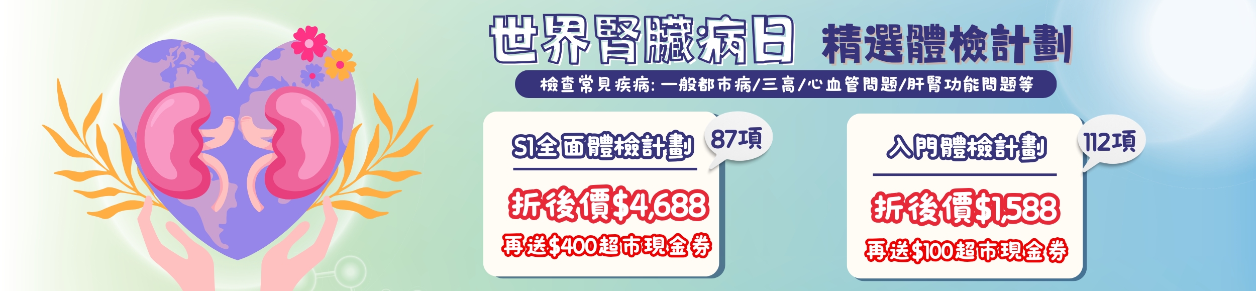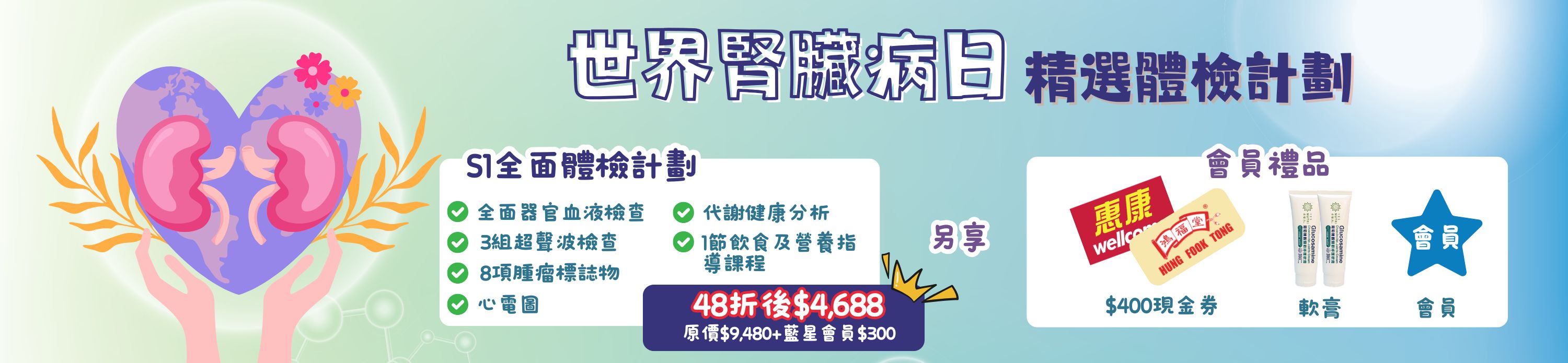 立即把握世界腎臟病日限定優惠:凡購買指定男/女士體檢計劃+藍星會員($300),即可享會員折扣優惠!