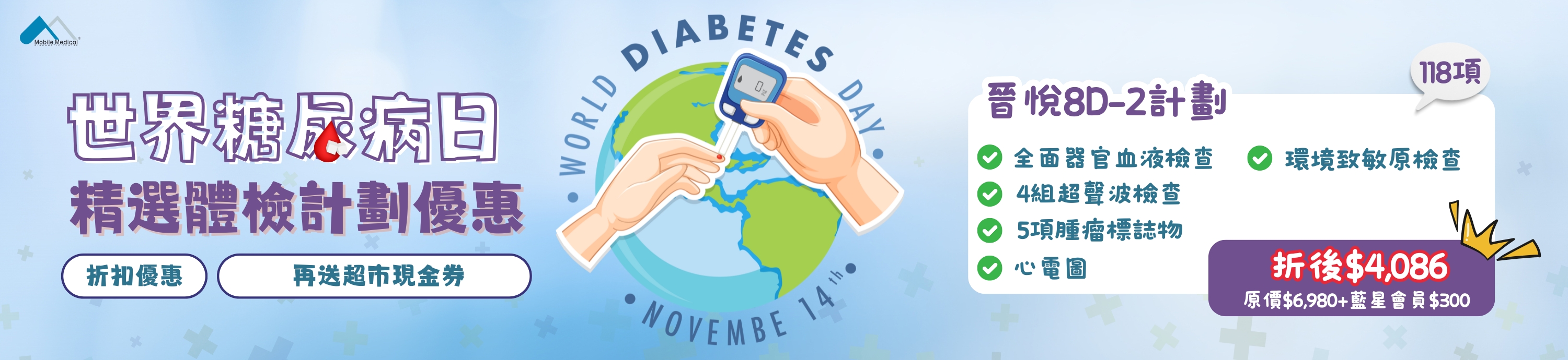 為響應「世界糖尿病日」,期間限定優惠推出:凡購買指定男/女士體檢計劃+藍星會員($300),即可享折扣及禮品優惠!