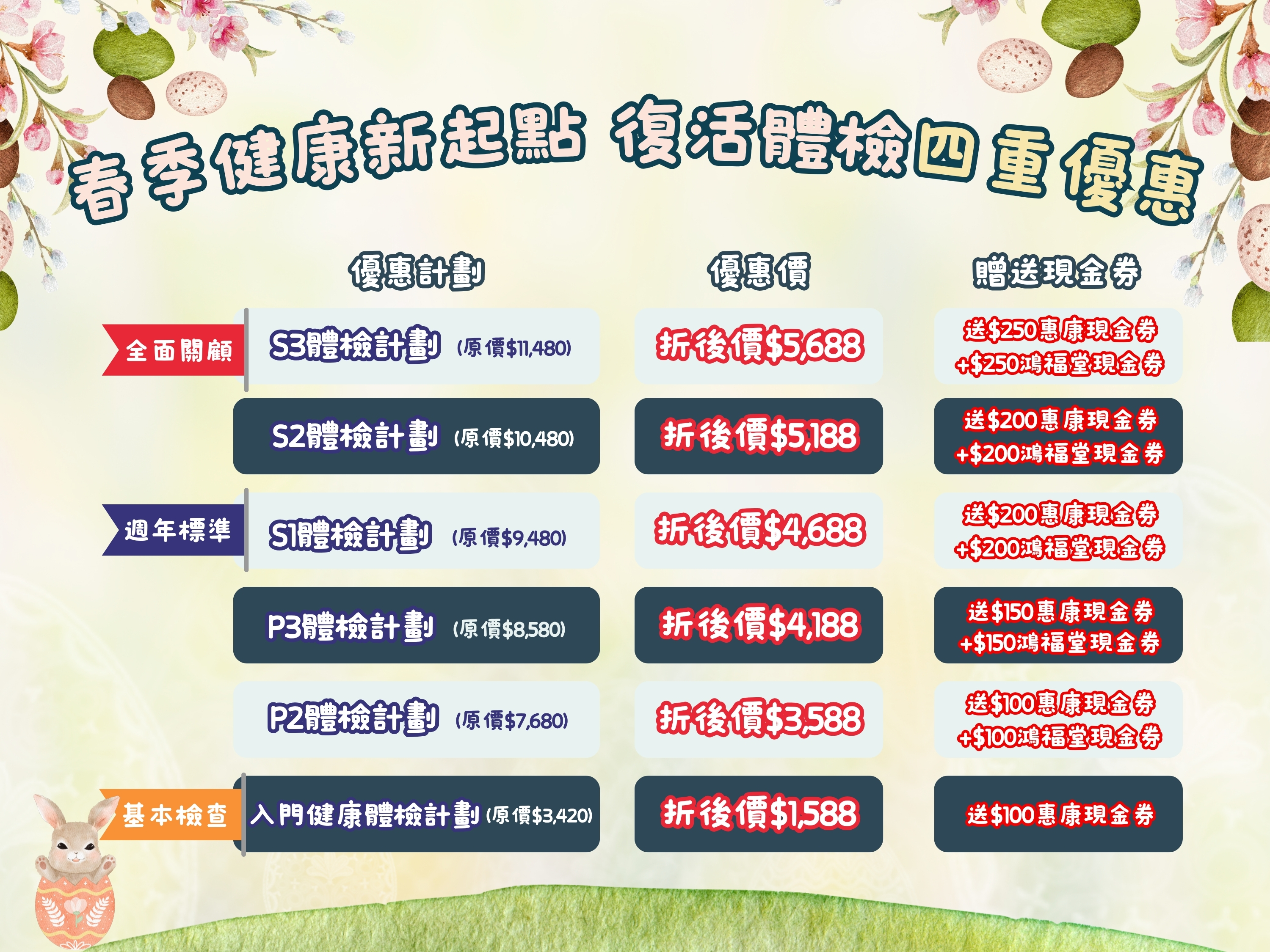 都市人生活易 被工作緊張、睡眠、運動量不足及飲食不定時等的不良生活習慣導致「亞健康」。美邦為切合客人對身體檢查的需要而提供不同類型的身體檢查優惠。