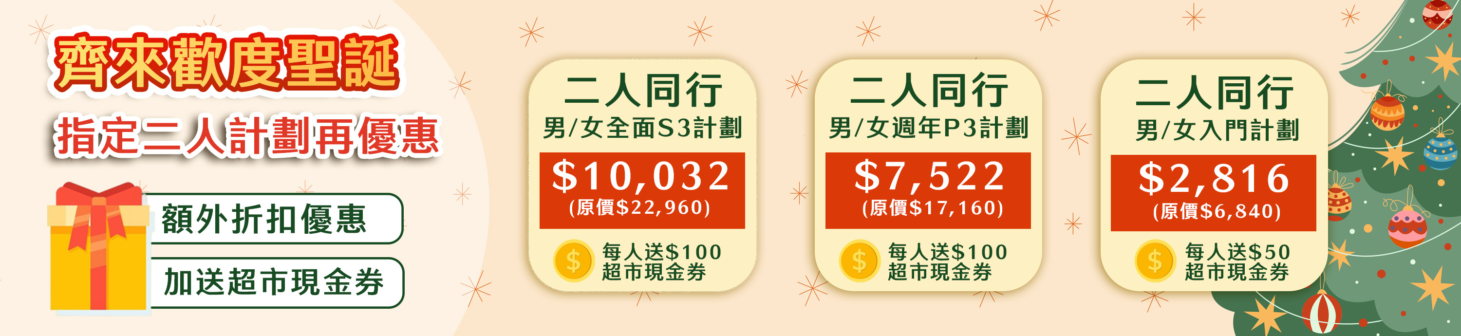 3) 購買2個 男/女 入門計劃,原價$6,840,優惠價$2,816/2個,再每人送$50惠康現金券 (按此了解)